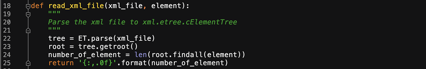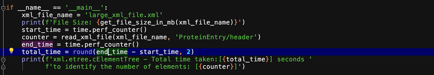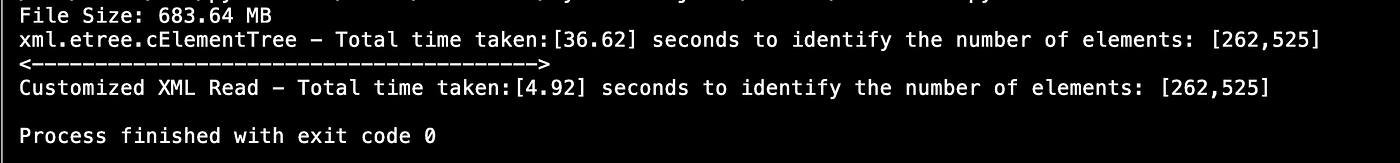print(f'xml.etree.cElementTree - Total time taken:[{total_time}] seconds to identify the number of elements: [{counter}]') print("<---------------------------------------->") start_time = time.perf_counter()