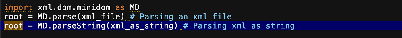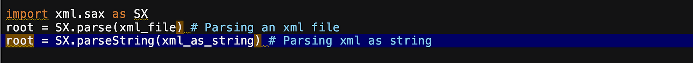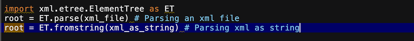- xml.etree — Simplest way of processing the xml files and it'south lightweight.